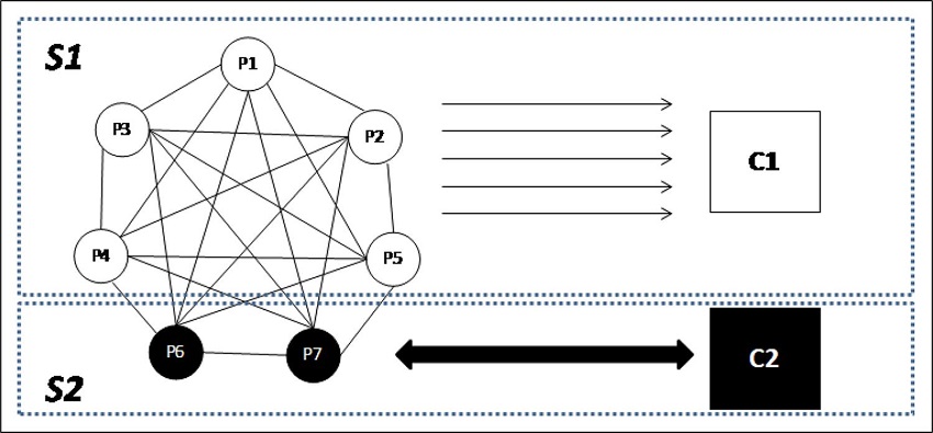 S1: subsistema que envolve cinco produtores (P1 a P5) que, embora já tenham passado pela transição para a produção orgânica, comercializam o produto como leite convencional sem o apelo de orgânico ou agroecológico, uma vez que o comprador (C1) não mantém este apelo de diferenciação;