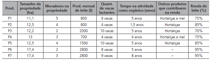 Todos os produtores rurais entrevistados neste SAD têm a atividade leiteira como a principal fonte de renda e apenas utilizam a mão de obra familiar para isso. Verificou-se uma variação na produção leiteira, nas propriedades estudadas, entre 800 e 2800 litros de leite por mês. O tempo na atividade de produção orgânica parece ter influenciado o volume de leite produzido, pois havia produtores com largo tempo de experiência e alta produção, como o P7. Por outro lado, havia variação de produção entre aqueles produtores com tempo médio de cinco anos. A diferença de produção de leite pode ser explicada pela quantidade de vacas lactantes de cada família produtora. A genética e práticas de manejo do rebanho também são características que podem influenciar a produção, no entanto, tais variáveis não foram observadas neste estudo.