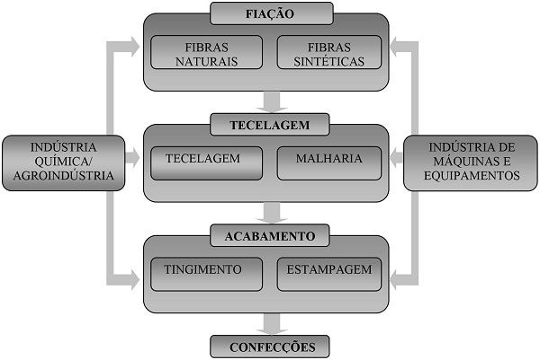 O complexo têxtil, por sua vez, constitui o núcleo de uma cadeia produtiva ao qual estão associados segmentos de outros setores industriais, como o químico, o agroindustrial, o de máquinas e equipamentos, entre outros, que estão ligados à cadeia como fornecedores de matérias-primas, insumos e máquinas.