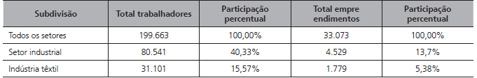Isso mostra que o setor têxtil ainda possui grande importância na região como principal segmento produtivo da indústria de transformação, representando o principal segmento empregador de mão de obra da região.