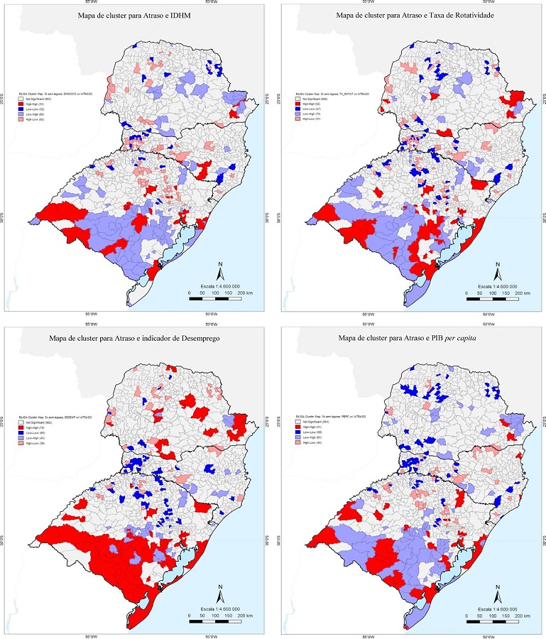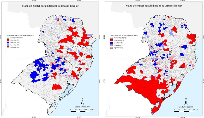 No Rio Grande do Sul também está concentrado o maior número de clusters do tipo AA para o atraso escolar, nas mesorregiões Sudoeste, Sudeste e Metropolitana de Porto Alegre, chamando-se a atenção, também, para a mesorregião Metropolitana de Curitiba. Neste caso, municípios em que os estudantes adolescentes têm alto índice de defasagem escolar afetam os municípios vizinhos, fazendo com que a evasão escolar seja realidade em toda uma região. Os clusters do tipo BB, para o atraso escolar, estão distribuídos em diversas mesorregiões do Sul do Brasil, chamando-se a atenção para o Oeste de Santa Catarina.