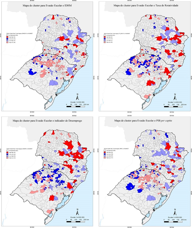 Nos resultados para a análise espacial univariada verificou-se a existência de autocorrelação espacial positiva dos dois indicadores educacionais (o abandono e o atraso escolar), o que foi corroborado com a existência de clusters significativos em que municípios com um valor alto para o indicador analisado estão rodeados por municípios em igual situação e vice-versa. Notou-se, com isso, a existência de agrupamentos de municípios com altos índices de evasão e atraso escolar e, por outro lado, agrupamentos de unidades espaciais com reduzidos índices para os dois indicadores educacionais.