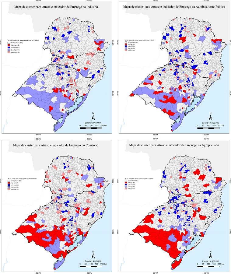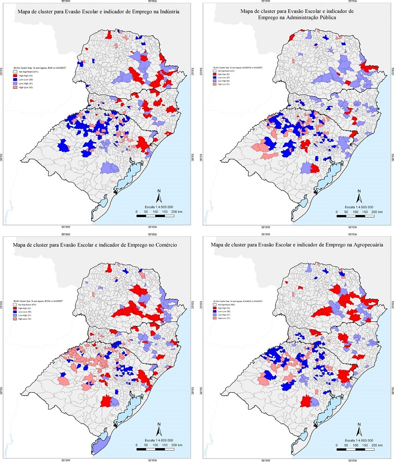 A Figura 3 mostra os mapas de cluster da relação entre a evasão escolar e os indicadores de emprego na indústria, na administração pública, no comércio e na agropecuária.