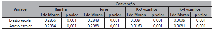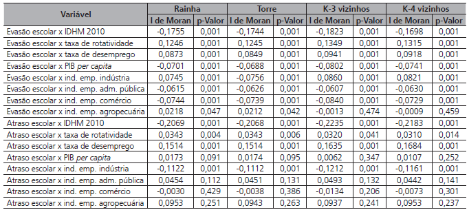 Na Tabela 2 também estão os resultados para a estatística I de Moran global bivariada, cruzando-se os indicadores socioeconômicos com o indicador educacional de atraso escolar. Grande parte dos resultados foi não significativa, sendo estes: o PIB per capita e os indicadores de emprego na administração pública, no comércio e na agropecuária.