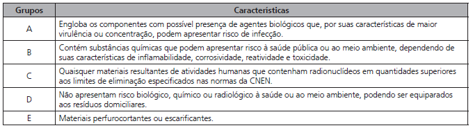 A RDC nº 306/04 da Anvisa (2004) e a Resolução nº 358/05 do Conama (2005) definem como geradores de RSS todos os serviços relacionados com o atendimento à saúde humana ou animal. Incluem-se ainda aqueles serviços de assistência domiciliar e de campo, laboratórios analíticos de produtos para a saúde, necrotérios, funerárias e serviços de embalsamamento, serviços de medicina legal, drogarias e farmácias, (inclusive as de manipulação), estabelecimentos de ensino e pesquisa na área da saúde. Verifica-se assim que os RSS são classificados em função de suas características e pelos consequentes riscos que podem acarretar ao meio ambiente e à saúde. De acordo com as normas editadas pela Anvisa e pelo Conama, os RSS são classificados em cinco grupos (Quadro 1).