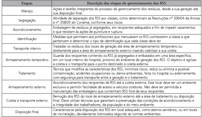 O processo de gerenciamento de RSS envolve várias fases, da geração ao descarte, e é importante a conscientização quanto ao significado e uso da terminologia correta (MENDES; CINTRÃO, 2004). Cada etapa precisa estar criteriosamente descrita em um Plano de Gerenciamento de Resíduos de Serviço de Saúde (PGRSS), apresentado no Quadro 2.