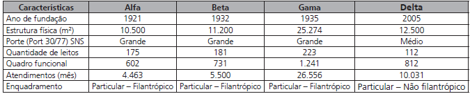 Este estudo baseia-se na pesquisa realizada em quatro entidades hospitalares situadas em três cidades da região noroeste do Rio Grande do Sul. Por motivo de sigilo, os estabelecimentos são nomeados como Alfa, Beta, Gama e Delta. A caracterização básica dos hospitais pesquisados, conforme apresentado no Quadro 3, considera sete elementos.