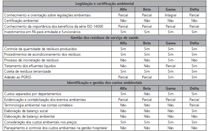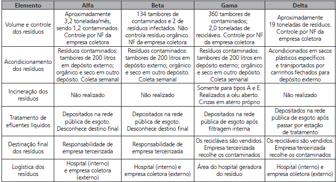 Quanto à coleta e destinação final dos resíduos, em todos os hospitais esse serviço é realizado por empresas terceirizadas, conforme pesquisa de Tramontini et al. (2009). No entanto, neste estudo, a destinação dos resíduos orgânicos e secos fica a cargo do município e os resíduos contaminados, por empresas ambientalmente licenciadas. A implementação de um PGRSS, considerada como uma importante ferramenta de gestão numa entidade hospitalar (VENTURA; REIS; TAKAYANAGUI, 2010), estabelecido pela RDC nº 306/04 da Anvisa (2004), é adotado pelos hospitais Gama e Delta e apenas parcialmente pelo Alfa e Beta.