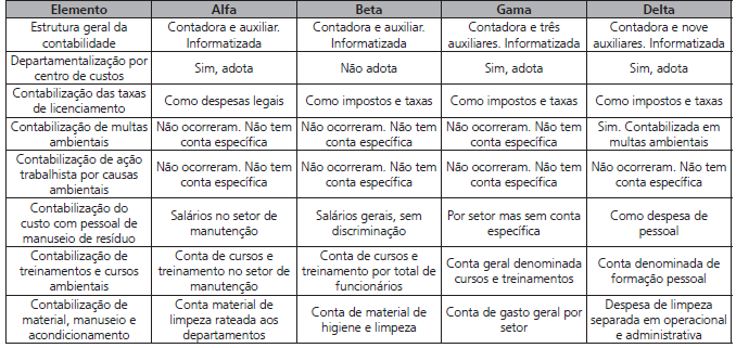 No que tange à identificação dos custos de natureza ambiental, corrobora-se o estudo de Keitel et al. (2011) de que esse é um dos maiores problemas nas organizações, visto que, contabilmente, esses custos são incluídos dentro de contas contábeis diversas e não especificadamente com denominação ambiental. Essa constatação também pode ser comprovada pelo conteúdo apresentado no Quadro 6.