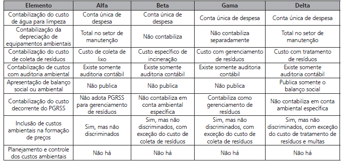 Outros aspectos relacionados à contabilização e à gestão de custos ambientais também foram identificados. Por exemplo, nenhum dos hospitais elabora e divulga o balanço ambiental; apenas o hospital Gama informou a elaboração do balanço social. Os custos decorrentes do PGRSS também têm registro deficiente. Dois hospitais (Beta e Delta) não contabilizam em conta específica, um (Gama) contabiliza em conta ambiental geral – gerenciamento de resíduos. O hospital Delta não adota PGRSS. Quanto à formação de preços, todos os hospitais informaram a inclusão dos custos ambientais na base de cálculo, porém juntamente dos demais custos e sem informação específica. Por fim, todos os contadores dos hospitais informaram que não há ações efetivas que caracterizem um processo de planejamento e controle de custos ambientais.