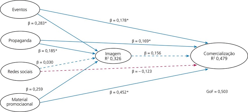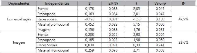 Existe influência significativa (p-valor = 0,000) e positiva (β = 0,452) do Material promocional sobre a Comercialização. Sendo assim, quanto maior o Material promocional, maior tende a ser a Comercialização;
