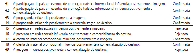 O poder de explicação do modelo é relativamente baixo com relação ao constructo imagem (0,326) e mediano quanto ao constructo comercialização de um destino turístico (0,479). O Quadro 1 sumariza as hipóteses testadas no estudo.
