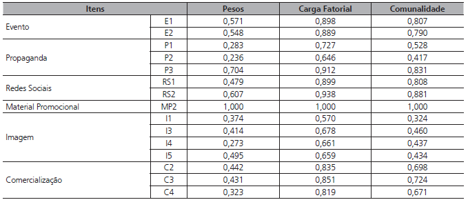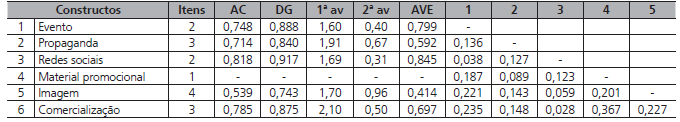 O modelo de mensuração é apresentado na Tabela 1. Algumas variáveis foram excluídas, devido à baixa carga fatorial, e todas que permaneceram apresentam cargas fatoriais acima de 0,5.