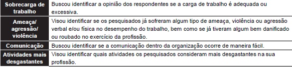 A partir das categorias descritas no Quadro 1, a pesquisa buscou realizar a coleta de dados de maneira que os objetivos da pesquisa fossem respondidos, identificando-se, por exemplo, a existência ou não de sobrecarga de trabalho, ameaça/agressão/violência no trabalho.