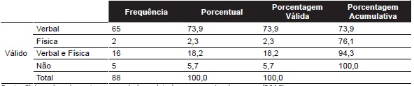 Conforme exposto na Tabela 2, observa-se que 5,7% dos respondentes afirmaram não ter sofrido nenhum tipo de ameaça/violência/agressão verbal ou física no exercício da atividade profissional, enquanto que 73,9% da amostra afirmou já ter sofrido esse tipo de acometimento no exercício da função. Esses dados confirmam os apontamentos da Assojaf-GO (2013; 2015) e de Merlo et al. (2012) no tocante a essa questão.