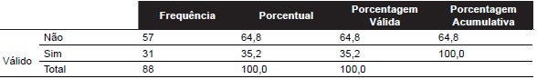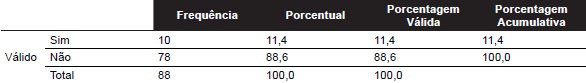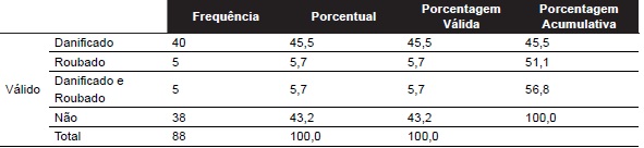 A Tabela 3 mostra que 43,2% da amostra afirma não ter tido um bem particular danificado ou roubado no exercício da função, enquanto 45,5% indicou já ter tido um bem danificado enquanto na sua atividade laboral. Dentre aqueles que afirmaram ter tido um bem danificado ou roubado, 68,2% afirmaram não ter tido seu prejuízo ressarcido pela administração. Nessa perspectiva, um estudo realizado com os Oficiais de Justiça da Justiça Federal, lotados na Central de Mandados de Porto alegre, o qual buscava investigar as consequências provocadas pelo trabalho na saúde destes profissionais, apontou que, dentre os pesquisados no exercício da sua função, 63,8% tiveram bens danificados e 38,8% tiveram bens roubados (MERLO et al., 2012). Desse modo, tanto neste estudo quanto no estudo de Merlo et al. (2012), mais de 45% dos participantes declararam já ter tido algum bem danificado na prática da atividade profissional.