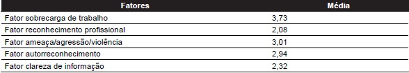 Esses fatores indicam os fatores ocupacionais que causam estresse na atividade profissional. O fator sobrecarga de trabalho apresentou a média mais elevada em relação aos demais e pode ser indicado como o principal fator relacionado ao estresse ocupacional. Por outro lado, o fator reconhecimento profissional foi o que apresentou a menor média em relação aos demais.