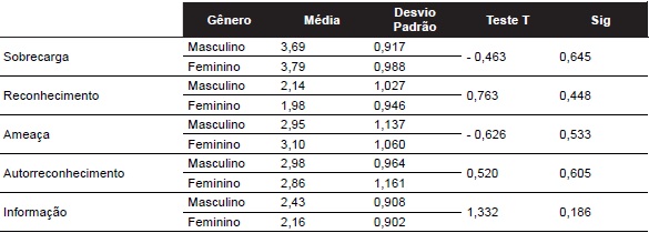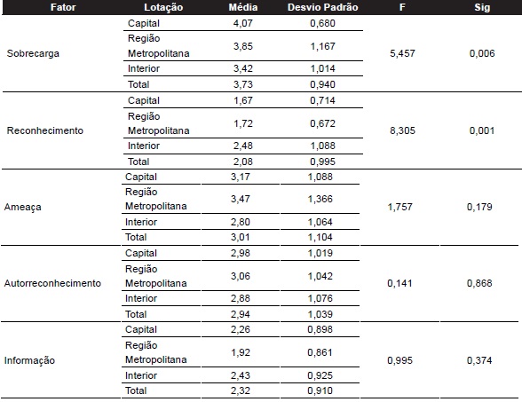 Os resultados indicam que não existe diferença em nenhum dos fatores em função do gênero, não corroborando com o estudo de Stefano, Bonanato e Raifur (2013). Com relação ao local de lotação, verifica-se que a sobrecarga de trabalho e o reconhecimento são fatores nos quais existe diferença entre os grupos. Os resultados indicam a existência de diferença entre os lotados na capital e os lotados no interior, com médias superiores, no caso da sobrecarga de trabalho para os lotados na capital e com média superiores, no caso do reconhecimento profissional para os lotados no interior.