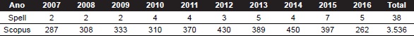Ao se realizar uma busca nas bases Scientifics Periodicals Eletronic Library (SPELL) para as palavras “stresse” e “estresse”, identificaram-se 47 publicações nacionais; na base internacional Scopus para as palavras “occupational stresse” and “workers” identificou-se um total de 7.069 artigos sem restrições de datas de publicações. Dentro de um corte temporal de 10 anos (2007 a 2016), a base Spell tem um total de 38 artigos indexados, já a base Scopus tem um volume de 3.536 artigos, conforme observado na Tabela 1 a seguir: