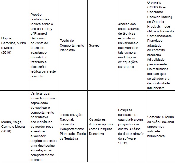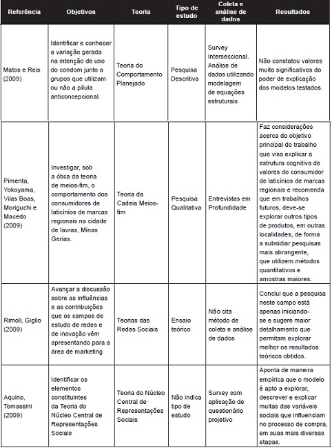 A maioria dos trabalhos valeu-se de teorias organizacionais, psicológicas e econômicas. Apenas a Teoria da Cadeia Meios-Fins, que foi construída com a finalidade explícita de subsidiar pesquisas mercadológicas, é utilizada nos trabalhos analisados. Isto não significa, entretanto, que a utilização das teorias tenha sido inadequada, pois as teorias indicadas, em sua maioria - principalmente as teorias organizacionais - são de amplo alcance, capaz de abranger múltiplos aspectos do comportamento dos consumidores.