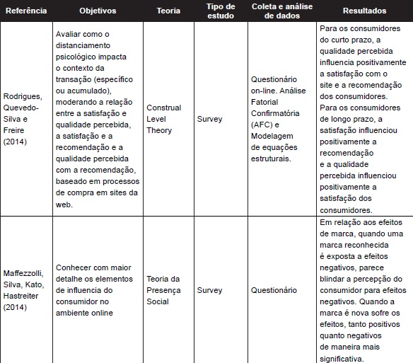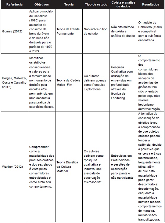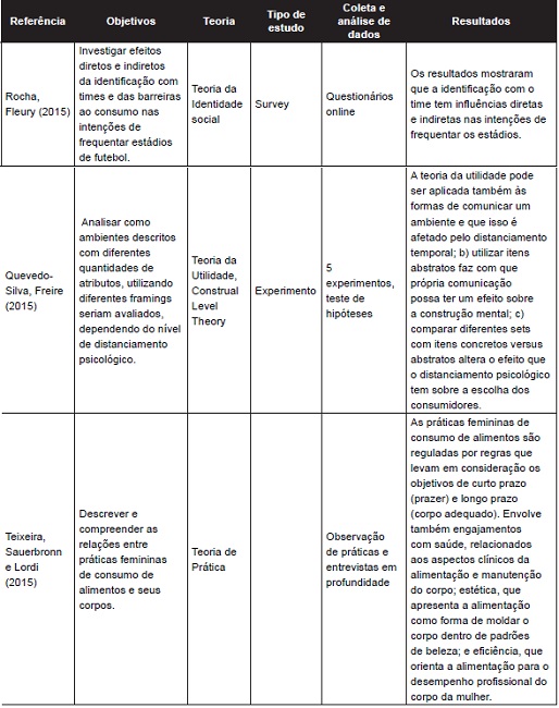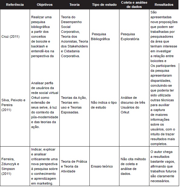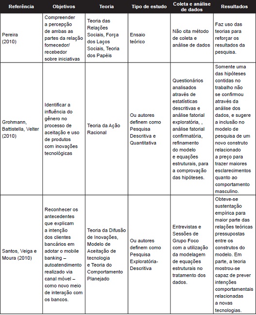 Após a apresentação das teorias utilizadas nos trabalhos então selecionados para esta análise, serão apresentados a seguir, os quadros com as demais informações, bem como seus respectivos autores, objetivos, tipo de estudo, coleta e análise de dados e uma breve descrição dos resultados obtidos nestes estudos.