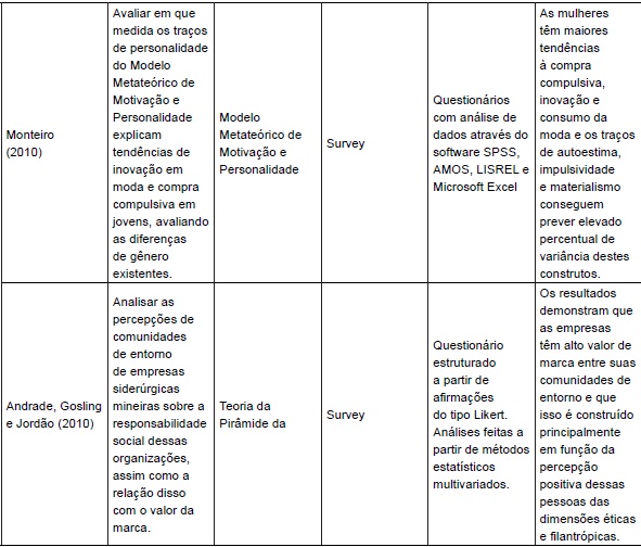 Cabe ressaltar, no entanto que teorias muito específicas foram utilizadas em alguns casos. Como a Teoria da Pirâmide da Responsabilidade Social, utilizada na pesquisa sobre o valor de marca e responsabilidade social em siderúrgicas mineiras (ANDRADE; GOSLING JORDÃO, 2010). Esta teoria é utilizada para favorecer o estudo das percepções de comunidades de entorno de empresas siderúrgicas. Embora o estudo tenha buscado relacionar essa percepção com o valor de marca, fica claro que a teoria não foi utilizada no estudo de um objeto mercadológico.