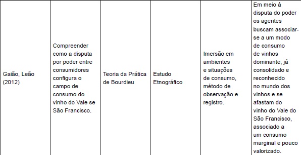 GAIÃO, B. F. S.; LEÃO, A. L. M. A. Configuração do campo de consumo do vinho do Vale do São Francisco: uma luta por preservação ou subversão da ordem vigente no consumo vínico. In: ENCONTRO DA ANPAD, 36. 2012. Anais [...]. São Paulo, set. 2012.