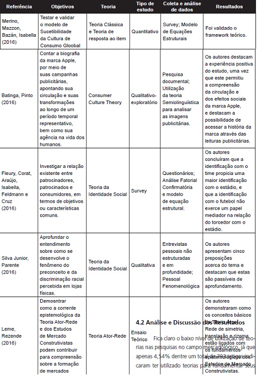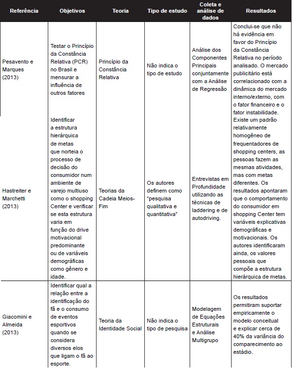 Foram analisados todos os artigos constantes dos anais dos eventos nacionais organizados pela Associação Nacional de Pesquisa em Administração e Contabilidade na Divisão Marketing, entre 2009 e 2016, que totalizaram 793. Deste total, apenas 4,54% envolvem algum tipo de teoria. Estes artigos são apresentados nos quadros 4.1, 4.2, 4.3, 4.4, 4.5, 4.6, 4.7 e 4.8 com indicação da autoria, objetivos, teoria utilizada, tipos de estudo, procedimentos de coleta de dados e análise dos resultados.