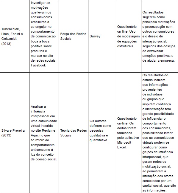 Cinco trabalhos são definidos como ensaios teóricos. A grande maioria, no entanto, envolve pesquisa empírica de campo. Três trabalhos foram elaborados com base em revisão bibliográfica. É o caso do trabalho que indica a utilização da Teoria das Relações Sociais, da Teoria dos Laços Fracos e da Teoria dos Papéis (PEREIRA, 2010). Neste trabalho o autor faz considerações sobre as teorias, embora sem discutir o seu alcance. É o caso também do trabalho de Rimoli e Giglio (2009), que pode ser considerado como uma discussão acerca da Teoria das Redes Sociais. O artigo elaborado por Ferreira, Zdunczik e Simpson (2011), que trata dos fundamentos da Teoria da Atividade e de sua aplicação ao Marketing, também se fundamenta em dados bibliográficos, embora proceda à sua ilustração com o caso de uma empresa de telecomunicação, e conclui que trabalhos futuros se tornam necessários.