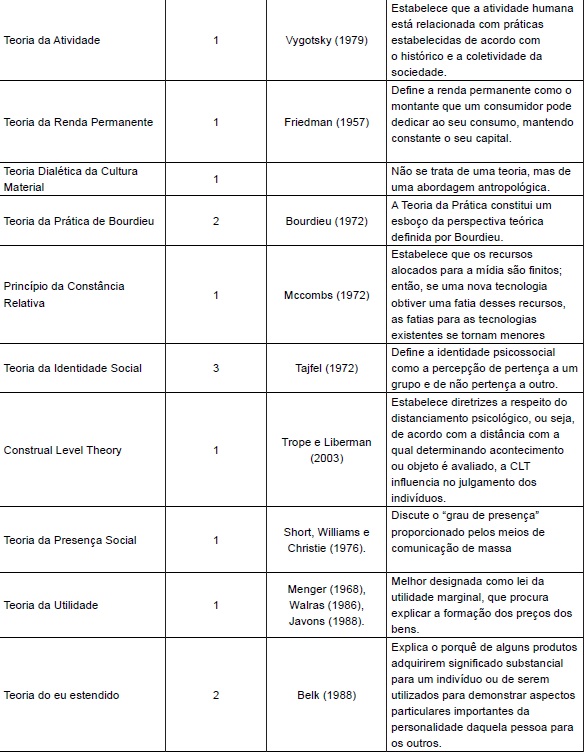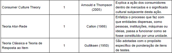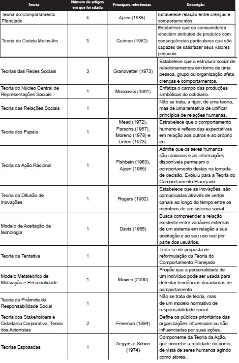 A teoria mais utilizada pelos autores dos artigos é a Teoria do Comportamento Planejado, foi identificada em quatro artigos. Em seguida vem a Teoria da Cadeia Meios-Fim, a Teoria das Redes Sociais e a Teoria do nível de Interpretação, cada uma identificada em três artigos. Seguem a Teoria da Identidade Social, a Teoria do Eu estendido e a Teoria de Prática, cada uma delas identificada em dois artigos. Outras teorias, que foram identificadas em um artigo são: Teoria de Renda Permanente, Teoria Dialética de Cultura Material, Teoria do Núcleo Central da Representação Social, Teoria da Atividade, Teorias da Ação, Modelo Metateórico de Motivação e Personalidade, Princípio da Constância Relativa, Teoria da Pirâmide da Responsabilidade Social, Teoria Clássica e Teoria da Resposta ao Item, Teoria da Decisão, Teoria do Terceiro Espaço, Teoria da Utilidade, Teoria Ator-Rede e Consumer Culture Theory.