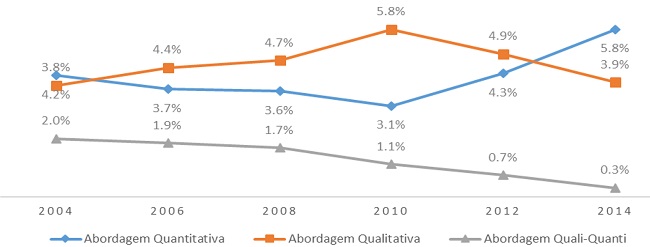 Ainda sobre a preferência pela abordagem metodológica, aparentemente a opção pela abordagem mista – quali-quanti – está perdendo força, ao passo que a abordagem quantitativa vem ganhando espaço nos últimos anos, como apresentado na Figura 1.