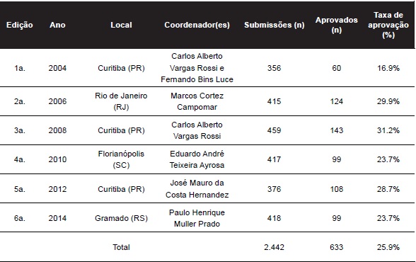 Destacamos o esforço dos autores em submeter artigos em outro idioma. Dos 29 artigos em língua estrangeira (1,2% do total de submissões), apenas um foi em espanhol (em 2006) e o restante em inglês.
