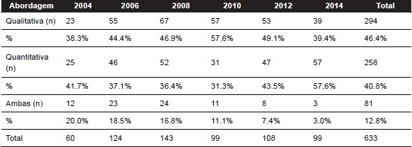 Com relação à opção pela abordagem metodológica dos trabalhos publicados no evento, há predominância da perspectiva qualitativa (n=294; 46,4%), em relação aos estudos quantitativos (n=258; 40,8%). As pesquisas que utilizam as duas abordagens metodológicas perfazem o total de 81 trabalhos (12,7%). A distribuição entre as edições do EMA está apresentada na Tabela 10.