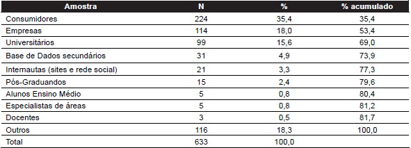 As empresas também figuram como amostras importantes para a pesquisa de Marketing nacional, com um total de 114 trabalhos (18%). O acesso foi feito por meio da entrevista com funcionários, CEOs, gestores e empresários. Outra fonte de dados importante são os estudantes universitários (n=99; 15,6%) e os estudantes de cursos de pós-graduação (n=15; 2,4%). Poucos trabalhos na área utilizam bases de dados secundários (n= 31; 4,9%).