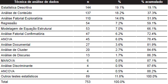 A estatística descritiva, que está presente em trabalhos quantitativos e qualitativos, foi utilizada em 144 artigos (19,1%). O detalhamento das opções de análise é apresentado na Tabela 13.