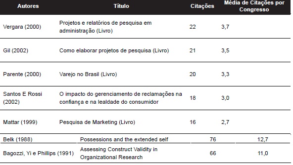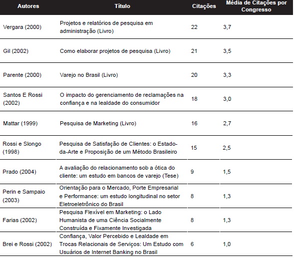 Das 10 referências bibliográficas internacionais mais citadas, quatro são livros traduzidos para o português e um livro em inglês, Apenas o livro mais citado é teórico [Administração de Marketing – Kotler (2000)], referenciado em média 34,7 vezes por edição do congresso. Os outros quatro livros são de métodos de pesquisa e análise de dados. O artigo científico mais citado é o célebre trabalho “A congnitive model of the antecedentes and consequences of satisfaction decisions” de Oliver (1980). Ressalta-se que, em média, as dez referências mais citadas foram utilizadas 112 vezes pelos acadêmicos que publicaram no EMA.