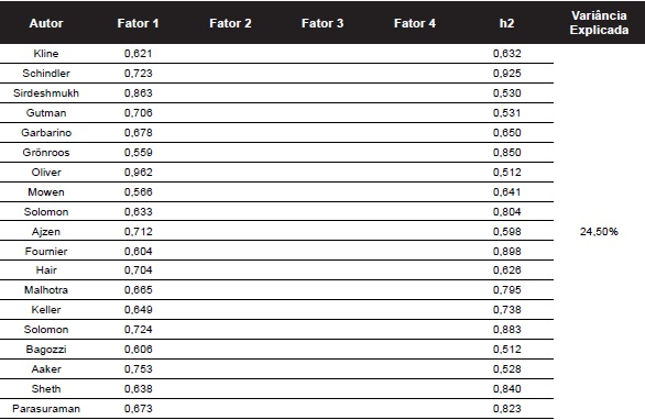 Após várias etapas de refinamento do modelo, no qual se buscou identificar comunalidades (h2) e cargas fatoriais superiores a 0,50, além cargas cruzadas inferiores a 0,40 (LEVIN; FOX, 2005), encontrou-se a solução fatorial mais adequada. Identificou-se quatro fatores com autovalor superior a 1, que explicaram 64,1% da variância total da amostra, com a identificação de 60 autores. O resultado dessa fase é apresentado na Tabela 16.