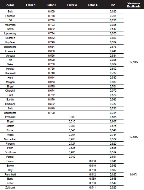O terceiro fator (12,6% da variância total) agrupou os autores de estratégias de marketing e administração estratégica geral. Finalmente, o quarto fator (9,94% da variância explicada) agrupou alguns autores de Marketing geral e serviços.