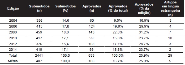 Curiosamente, a edição de 2014 foi a que apresentou menor quantidade média de referências (28,9 por artigo), contudo não é possível afirmar que isso seja uma tendência.