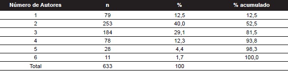 A Tabela 3 apresenta a quantidade de autores por artigo. Nota-se certa concentração na produção científica realizada por dois autores (40% do total). Trabalhos individuais somaram 12,5% do total (n=79), enquanto trabalhos com cinco ou mais autores representaram pouco mais de 6% do total (n=39; 6,1%).
