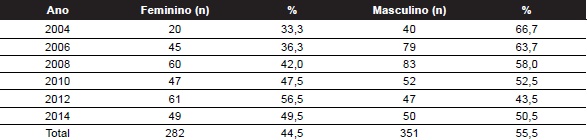 Analisando o perfil do primeiro autor de cada um dos 633 artigos dos Anais, constata-se que a maioria é do sexo masculino. Contudo, a participação das mulheres como primeira autoria nos trabalhos de Marketing vem crescendo, quando se comparam os dados das primeiras edições (2004: n=20; 33,3% e 2008: n=45; 36,3%) e média dos eventos (Mtotal=44,5%).
