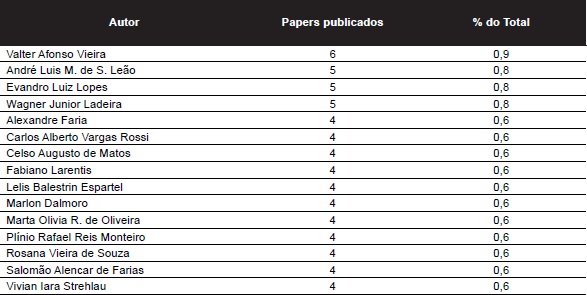 Ainda analisando o primeiro autor de cada trabalho, identificamos que o pesquisador mais produtivo do congresso no período verificado (2004-2014) é o Prof. Valter Afonso Vieira da Universidade Estadual de Maringá. O Prof. Valter teve 6 artigos (0,9% do total) publicados. Em seguida, os Professores André Luiz Maranhão de Souza Leão, Evandro Luiz Lopes e Wagner Junior Ladeira desenvolveram e publicaram 5 artigos cada (0,8%). A Tabela 5 mostra a classificação e a quantidade de artigos publicados dos autores mais produtivos.