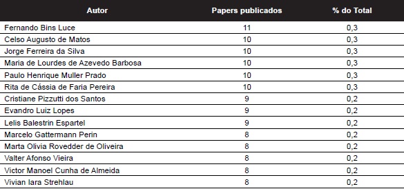 A análise da produtividade dos autores, sem considerar a posição na linha de coautoria, revela que o Prof. Fernando Bins Luce é o pesquisador com maior número de trabalhos aprovados nas edições do EMA (n=11). Também como destaque de produtividade acadêmica, figuram Celso Augusto de Matos, Jorge Ferreira da Silva, Maria de Lourdes de Azevedo Barbosa e Paulo Henrique Muller Prado, todos com 10 trabalhos aprovados. A Tabela 6 elenca os pesquisadores mais produtivos.