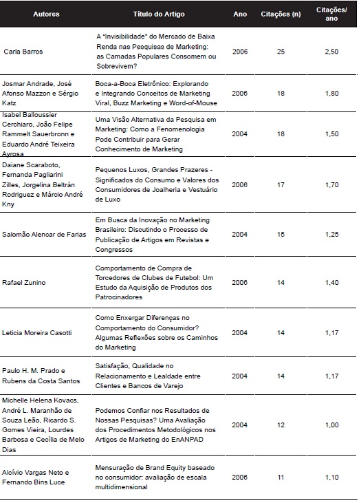 O trabalho mais citado (n=25 citações; 2,5 citações/ano) foi o artigo desenvolvido por Carla Barros intitulado “A invisibilidade do mercado de baixa renda nas pesquisas de marketing: as camadas populares consomem ou sobrevivem?”, que foi apresentado no EMA-2006. A Tabela 7 apresenta os trabalhos mais citados.