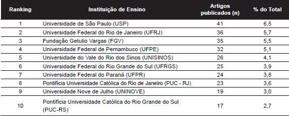 Analisando-se a produtividade das instituições de ensino, nota-se que a Universidade de São Paulo ocupa a primeira posição, com um total de 41 (6,5% do total) trabalhos publicados. Em segundo lugar, aparece a Universidade Federal do Rio de Janeiro (n=36; 5,7%). Nesse contexto, ressalta-se a importância das instituições de ensino superior públicas e confessionais, pois das 10 instituições mais produtivas em Marketing no ranking elaborado figura apenas uma instituição de ensino privada (Universidade Nove de Julho). O ranking detalhado é apresentado na Tabela 8.