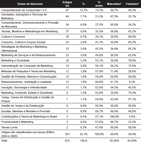 O tema de maior interesse de pesquisa foi o Comportamento do Consumidor (n=87; 13,7%). Em nossa classificação, agrupamos os artigos publicados nos temas Comportamento do Consumir I e II, pois essa diferenciação foi realizada apenas nas últimas edições do evento.