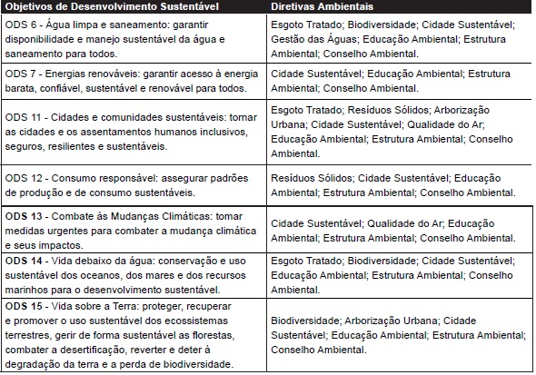 Primeiramente, considera-se que as Diretivas: Educação Ambiental, Estrutura Ambiental e Conselho Ambiental aparecem na relação proposta para todos os ODS porque incorporam ações de base para a gestão ambiental do município, contribuindo com todos os Objetivos elencados. Dando início a uma discussão detalhada, o ODS 6 relaciona-se com a gestão racional e eficiente dos recursos hídricos, incluindo, metas de proteção dos ecossistemas vinculados com a água e estruturação de sistemas de saneamento. Portanto, observa-se que este enfoque possui relação com as seguintes Diretivas Ambientais: