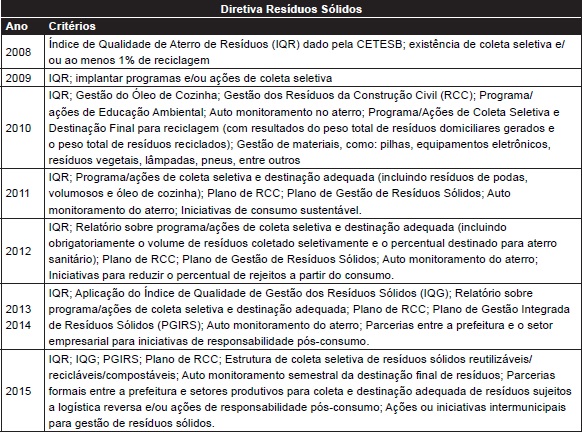 Ainda em relação às características do IAA, deve-se discutir que este se diferencia de outros índices porque sua composição sofre alterações no tempo. As resoluções anuais definem mudanças nos pesos das Diretivas, conforme discutido a partir da Tabela 1, além disso, ocorre a evolução nas ações avaliadas, situação exemplificada pelo Quadro 3 que demonstra as alterações de critérios considerados na Diretiva Resíduos Sólidos.