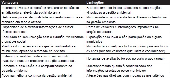 Dando continuidade aos resultados obtidos, o estudo das características do IAA, principal instrumento de operacionalização dessa política pública ambiental, demonstrou que o mesmo constitui uma tentativa de definir institucionalmente e, em grande escala, uma agenda ambiental mínima aos municípios capaz de promover a qualidade de vida da população. Por outro lado, promove-se uma padronização da realidade ambiental, sendo passível de críticas por apresentar propriedades tidas como “não-desejáveis” em um indicador, principalmente pelas alterações em sua construção metodológica ao longo dos anos. O Quadro 4 sintetiza as vantagens e limitações observadas a partir da análise do IAA.