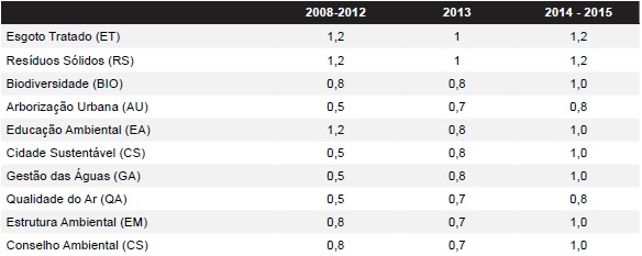 Verifica-se que, de 2008 a 2012, os pesos permaneceram inalterados, demostrando a manutenção das prioridades quanto aos temas da agenda ambiental. Neste período, constata-se uma distribuição mais heterogênea entre as diretivas, coexistindo temas com prioridade visivelmente elevada e outros em um patamar inferior, sendo que a diferença entre os pesos maiores (1,2 para ET, RS e EA) e os menores (AU, CS, GA, QA) atingiu 0,7. Em 2013, houve uma mudança significativa nos pesos praticados nos cinco anos anteriores, com exceção de BIO (permaneceu em 0,8). As prioridades se tornaram mais homogêneas, reduzindo as diferenças nos pesos entre as Diretivas, sendo que o patamar de 0,5 foi eliminado, o menor valor passou para 0,7, enquanto que o maior valor reduziu para 1,0.